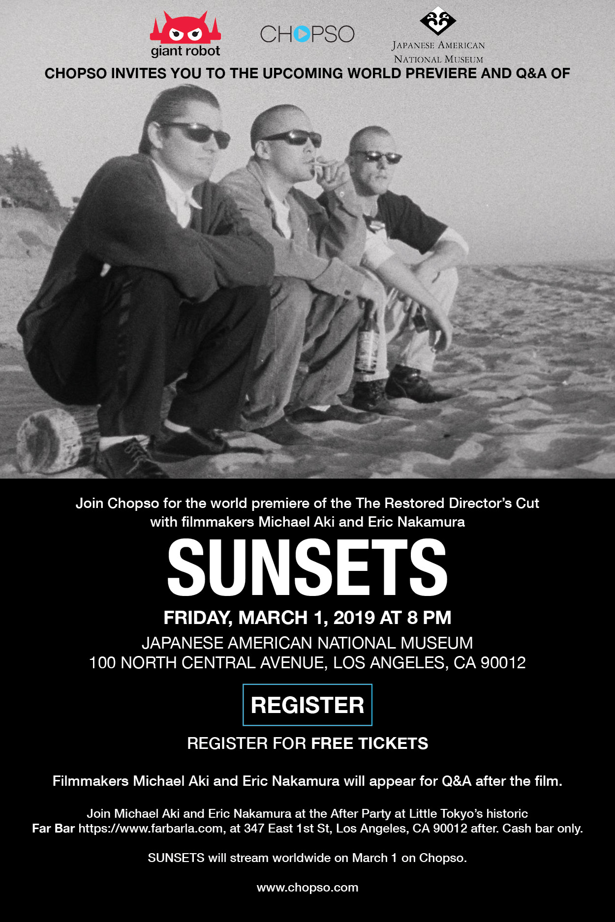 Chopso Screening: Sunsets February 22, 2019 by ksakai1 Share this: Click to share on X (Opens in new window) X Click to share on Facebook (Opens in new window) Facebook Click to share on LinkedIn (Opens in new window) LinkedIn Like Loading... Related