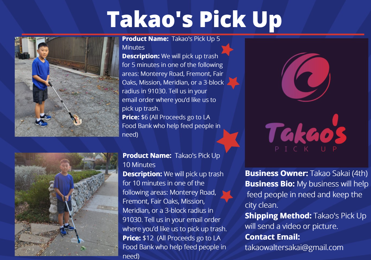 Support: My Son’s Trash pick up Business December 6, 2021December 6, 2021 by ksakai1 All proceeds will go to the LA Food Bank. If interested, email your order to takaowaltersakai@gmail.com Share this: Click to share on X (Opens in new window) X Click to share on Facebook (Opens in new window) Facebook Click to share on LinkedIn (Opens in new window) LinkedIn Like Loading... Related