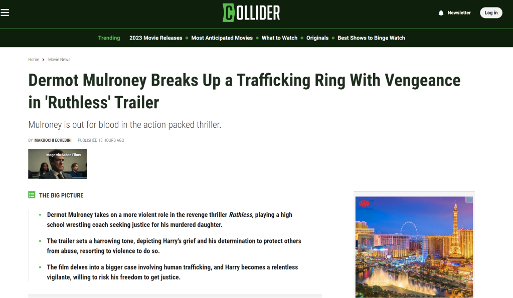 Vengeance is a dish best served cold, and in Dermot Mulroney‘s case — in a ruthless manner. The trailer for the new revenge thriller, Ruthless has been released. Mulroney, best known for starring in the iconic Julia Roberts movie My Best Friend’s Wedding, will be taking up a more violent role in this project for what is a just cause. Mulroney plays a high school wrestling coach, Harry, who is left mourning the death of his daughter, who was murdered under mysterious circumstances.